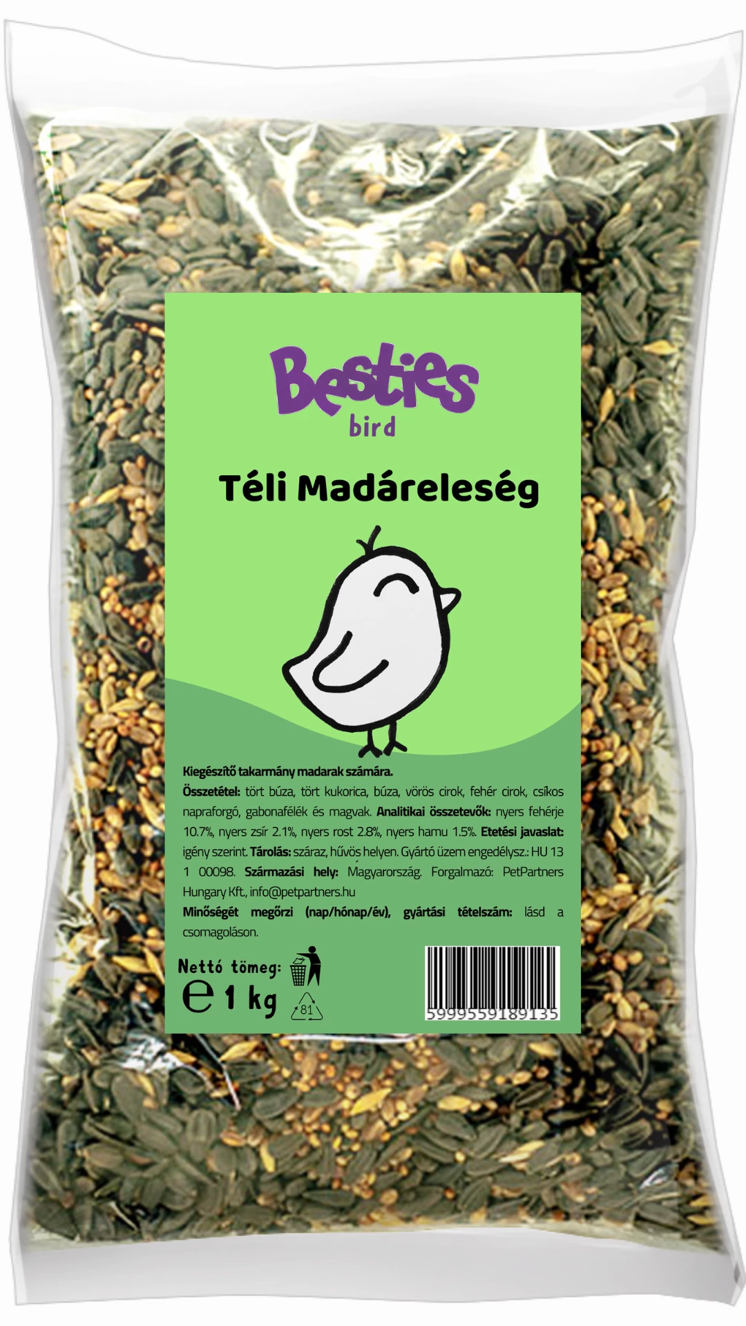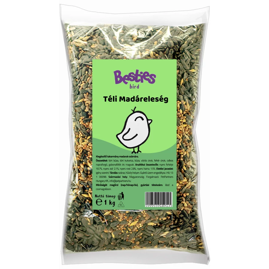 Kiegészítő takarmány madarak számára. Összetétel: fekete napraforgó, búza, sárga köles, vörös köles, kukorica, cirok, zab, repce Analitikai összetevők: nyers fehérje 10%, nyers zsír 9%, nedvesség 9%, nyers rost 11%, nyers hamu 8%. Etetési javaslat: igény szerint. Adagolása: az állatok igényeinek megfelelően. Kizárólag állati fogyasztásra! Tárolás: száraz, hűvös helyen. Minőségét megőrzi: a csomagolás hátoldalán feltüntetett időpontig. Származási hely: Magyarország. Forgalmazó: PetPartners Hungary Kft., info@petpartners.hu
