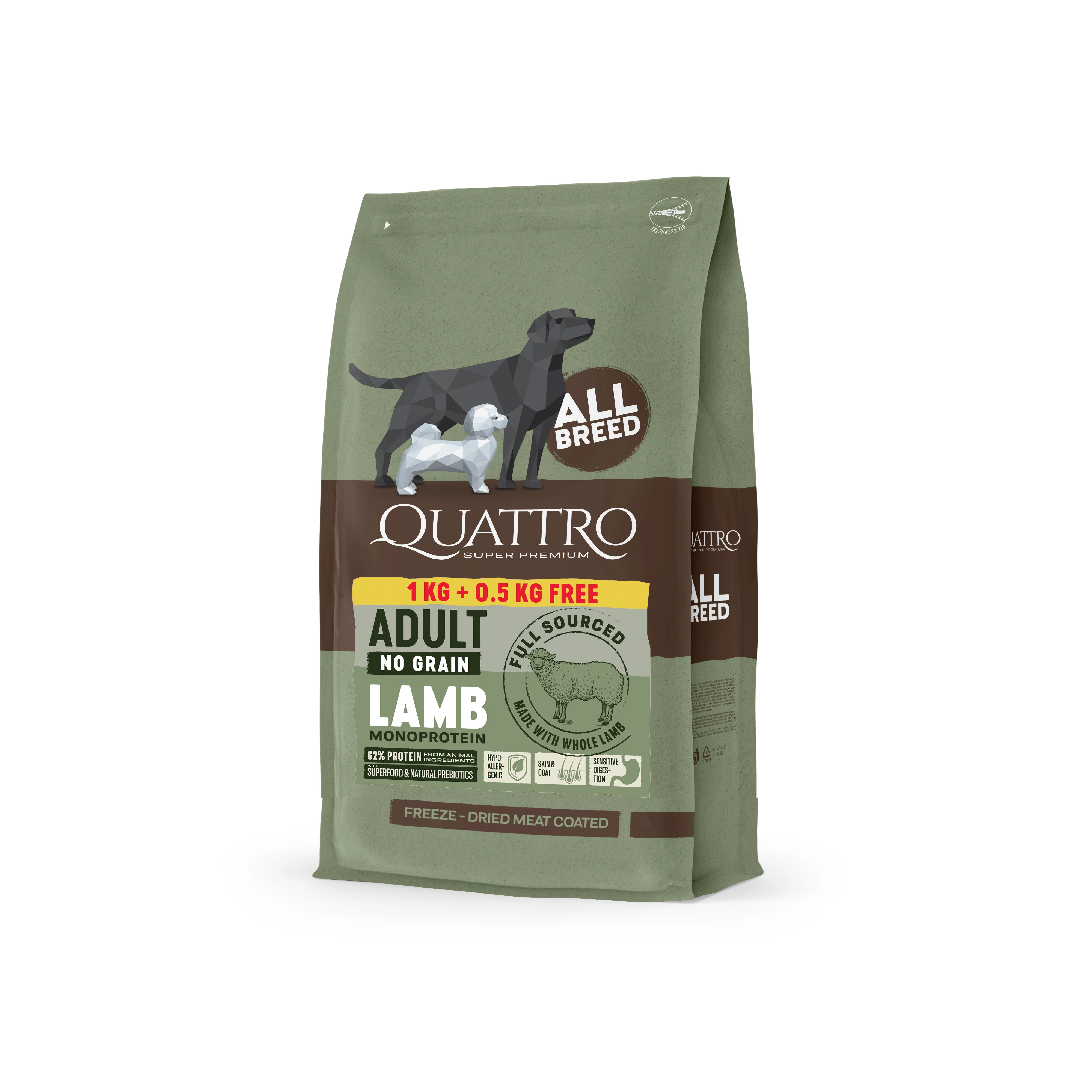 Bárány 36% (teljes értékű dehidratált bárány 26%, bárányzsír 10%), szárított burgonya, édesburgonya, sárgaborsó, hidrolizált bárányfehérje 2,5%, szárított cukorrépapép, borsófehérje, burgonyafehérje, lenmag, sörélesztő, ásványi anyagok, fagyasztva szárított bárány, prebiotikumok (csicsóka-inulin, MOS, yucca kivonat), szárított vörösáfonya, glükózamin (0,025%), kondroitin-szulfát (0,01%), szárított gyógynövény- és gyümölcskivonatok (rozmaring, kurkuma, szegfűszeg, grapefruit kivonat)